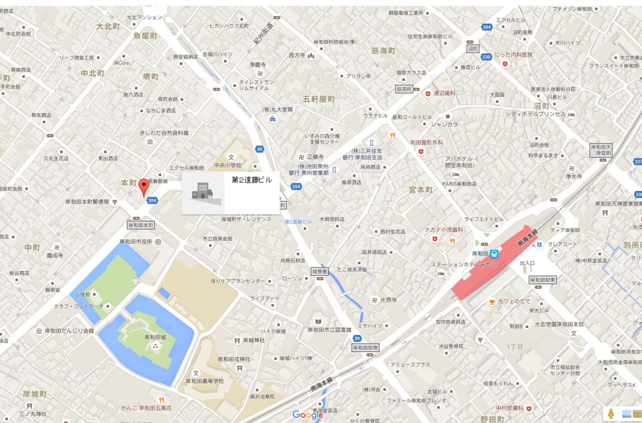 岸和田駅より徒歩10分。 府道204号線(旧国道26号線)、岸和田本町交差点そばです。