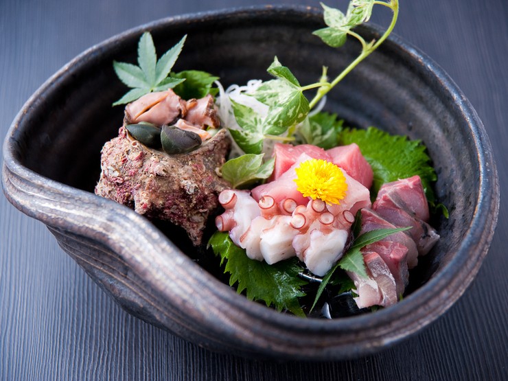 | お造り盛合せ その日仕入れた食材で調理します。少しずついろいろ食べたい方におススメ! ※写真のネタは一例です。 |