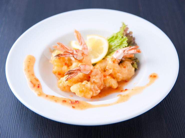 | ぷりぷりタイ風エビマヨ ボリュームのあるえびフリッターが5尾入っております。チリソースが、マヨネーズと良く合います。 |